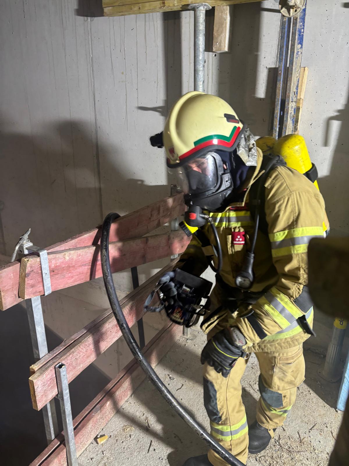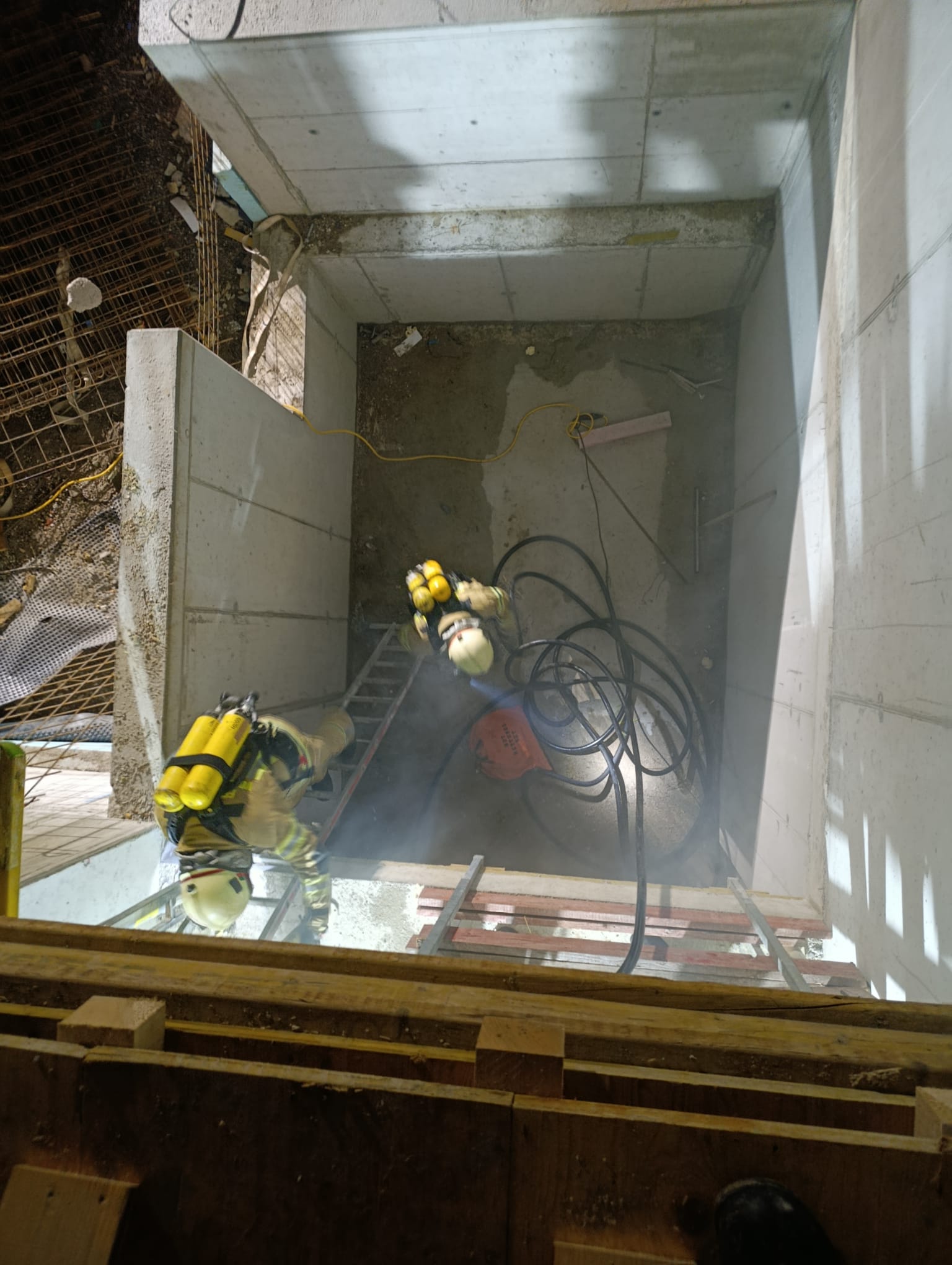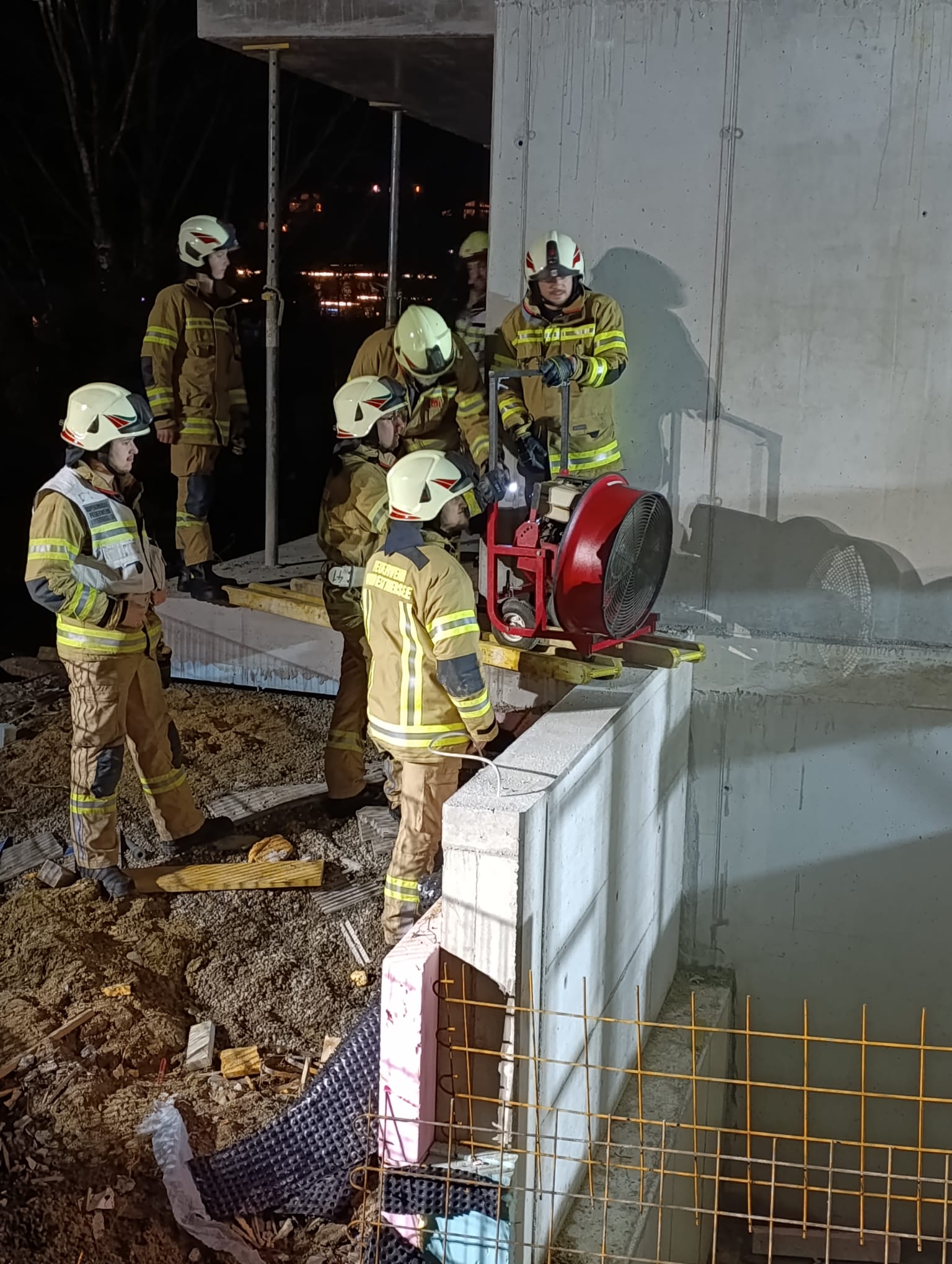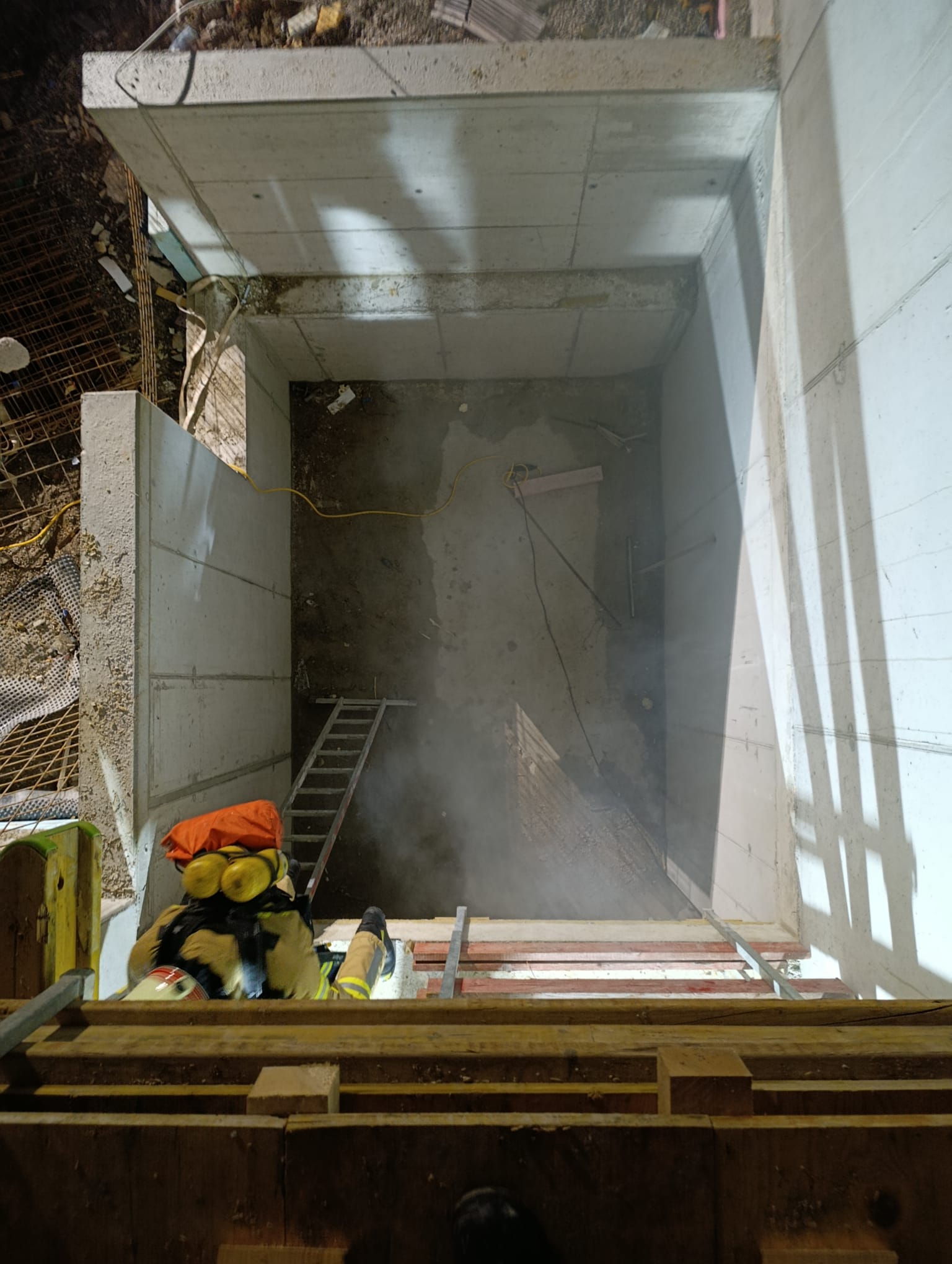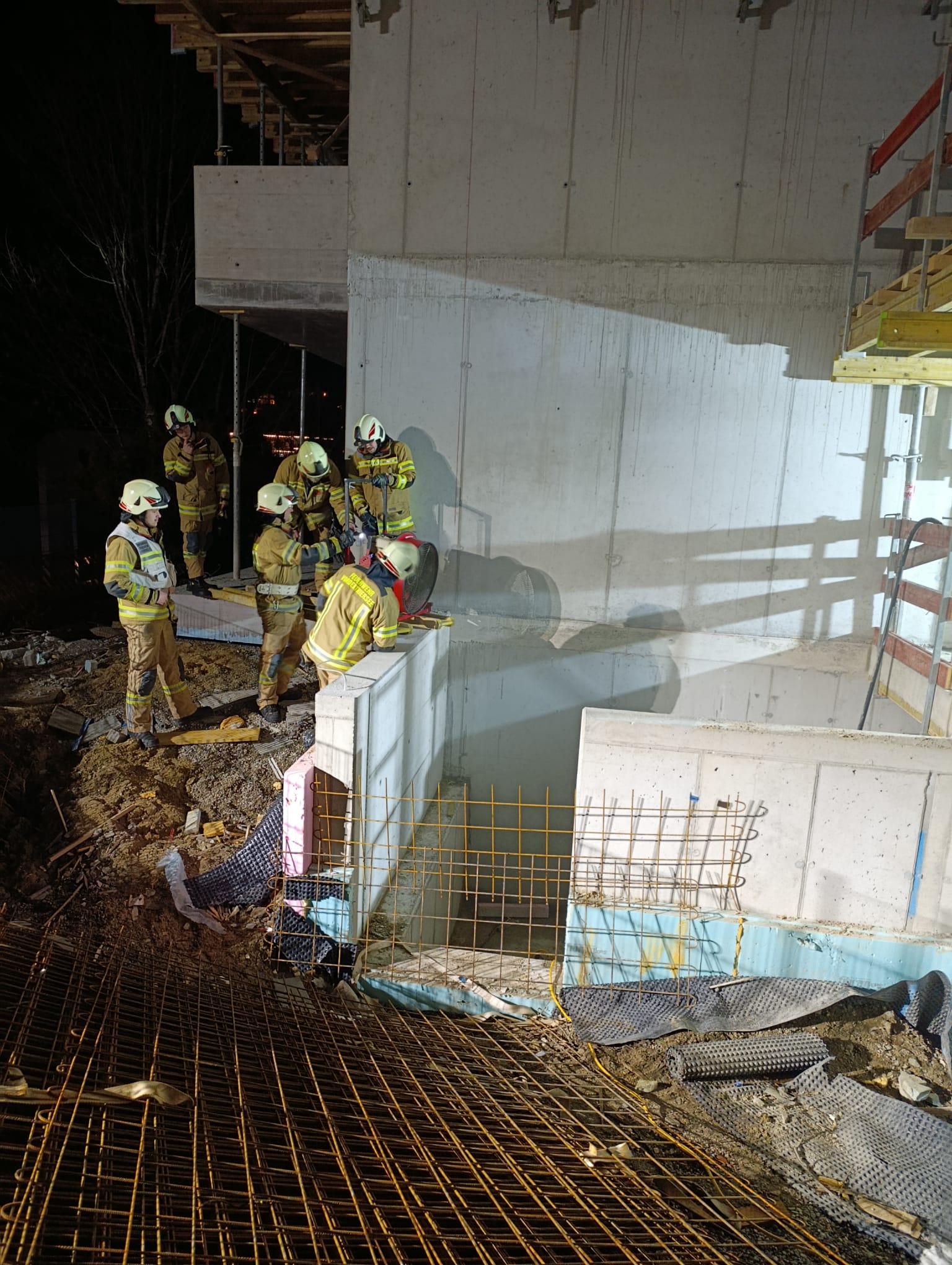 Übungsannahme war ein Brand auf einer Baustelle mit zwei vermissten Personen im Kellerbereich.