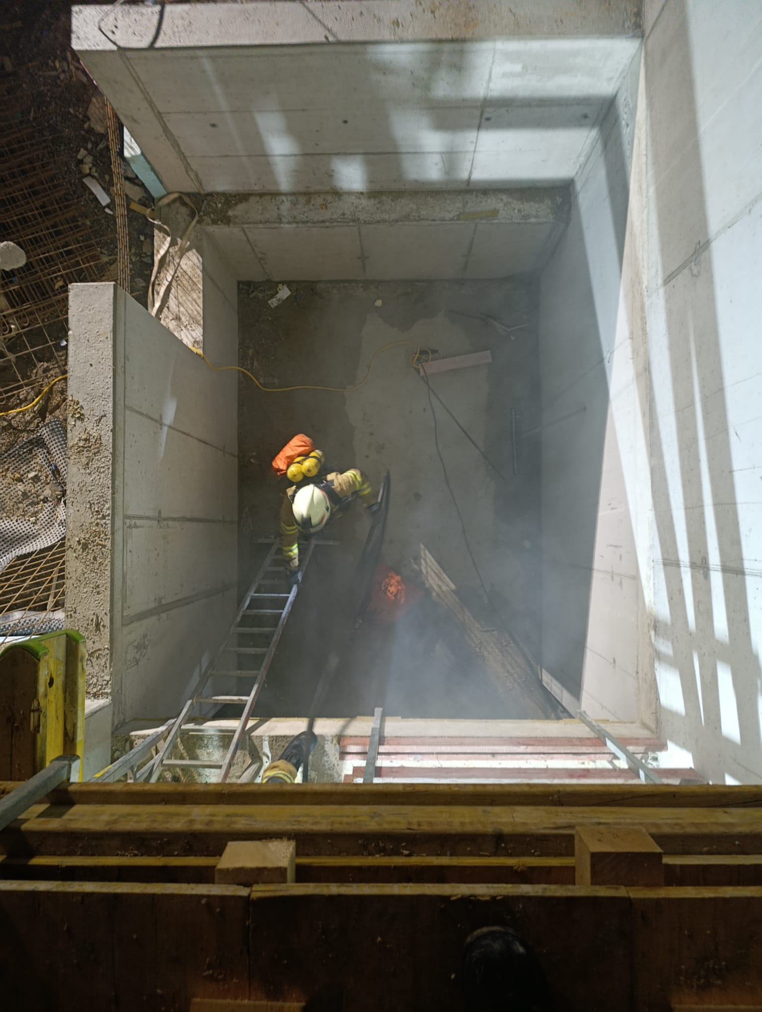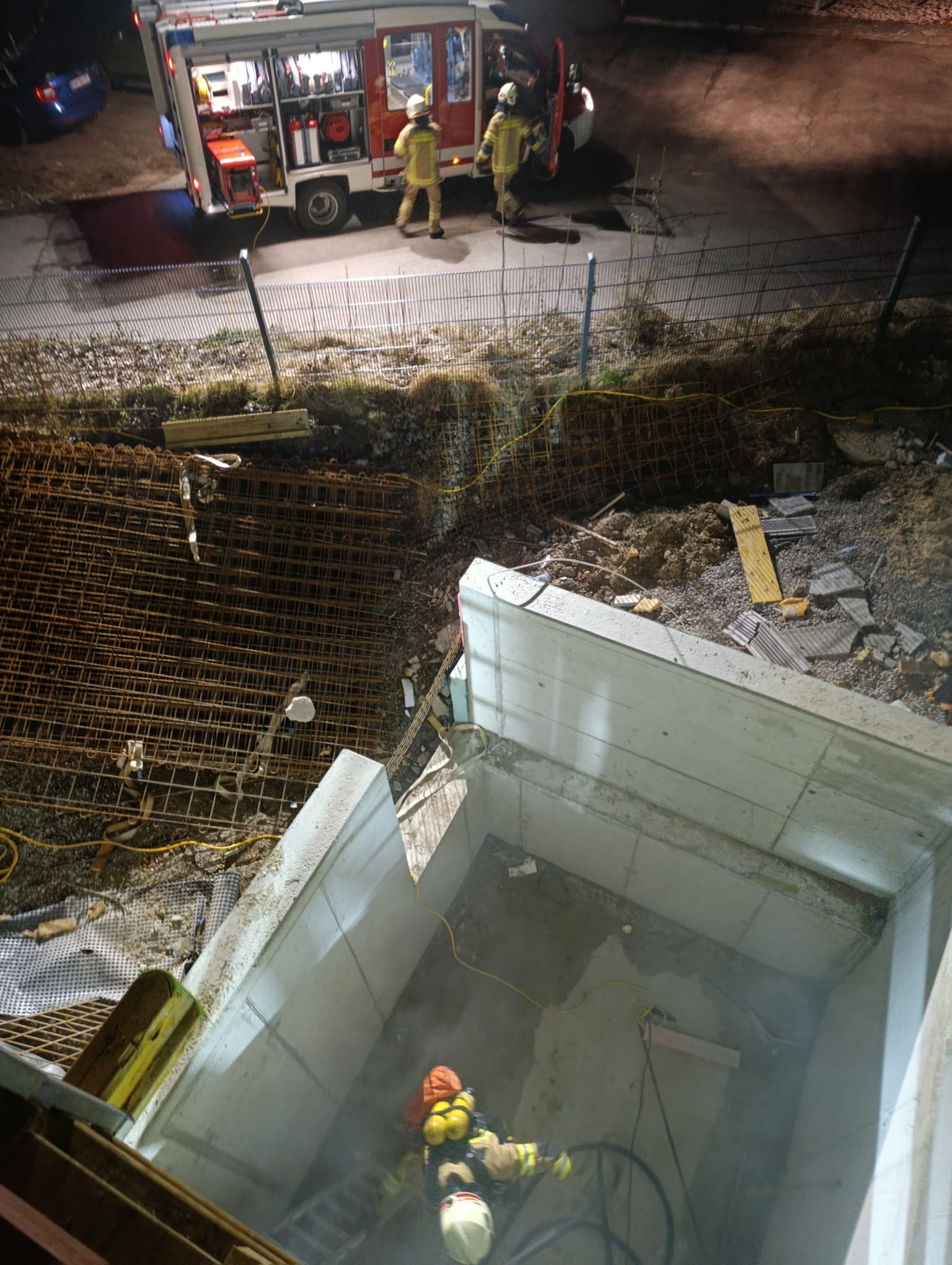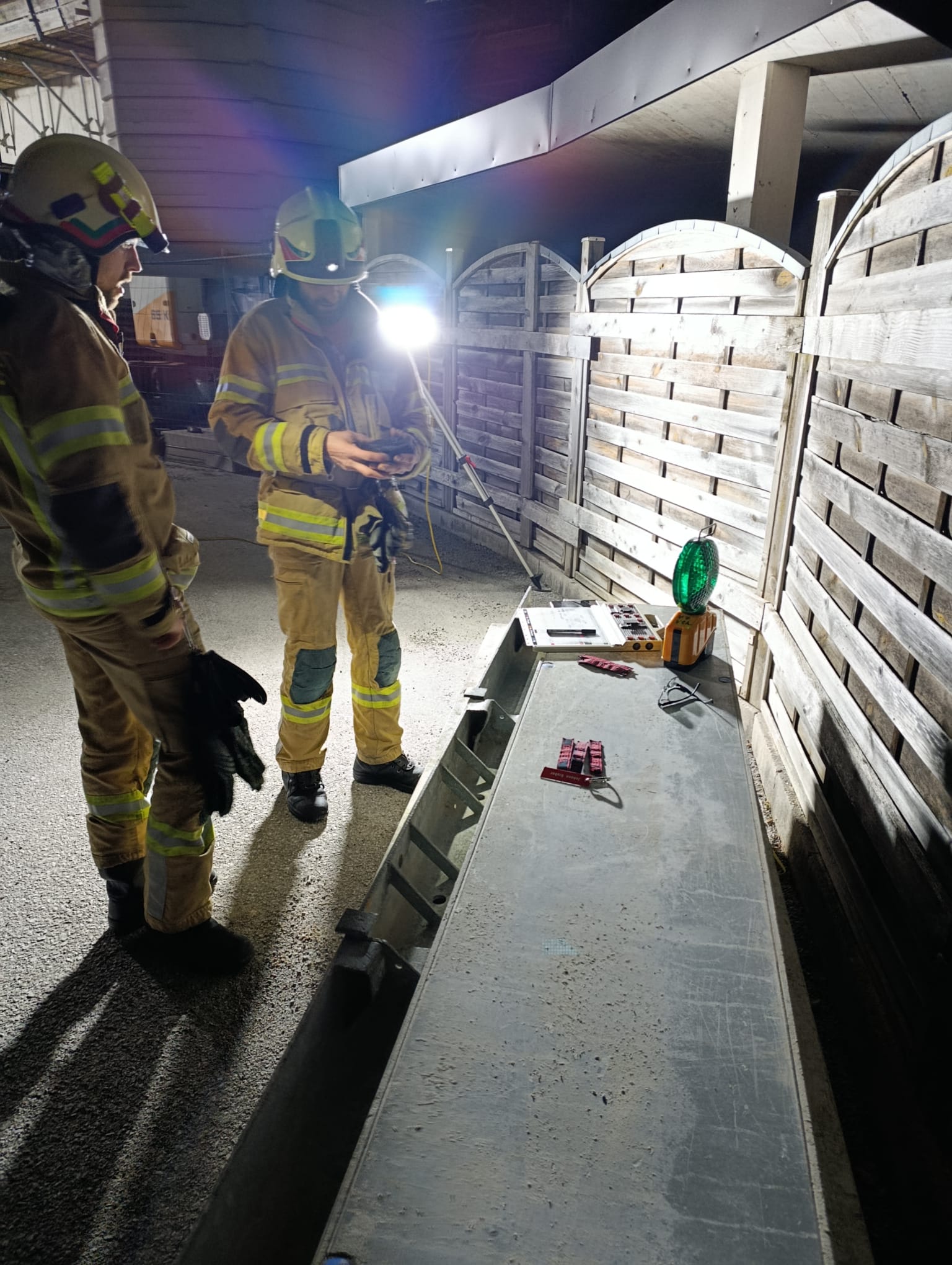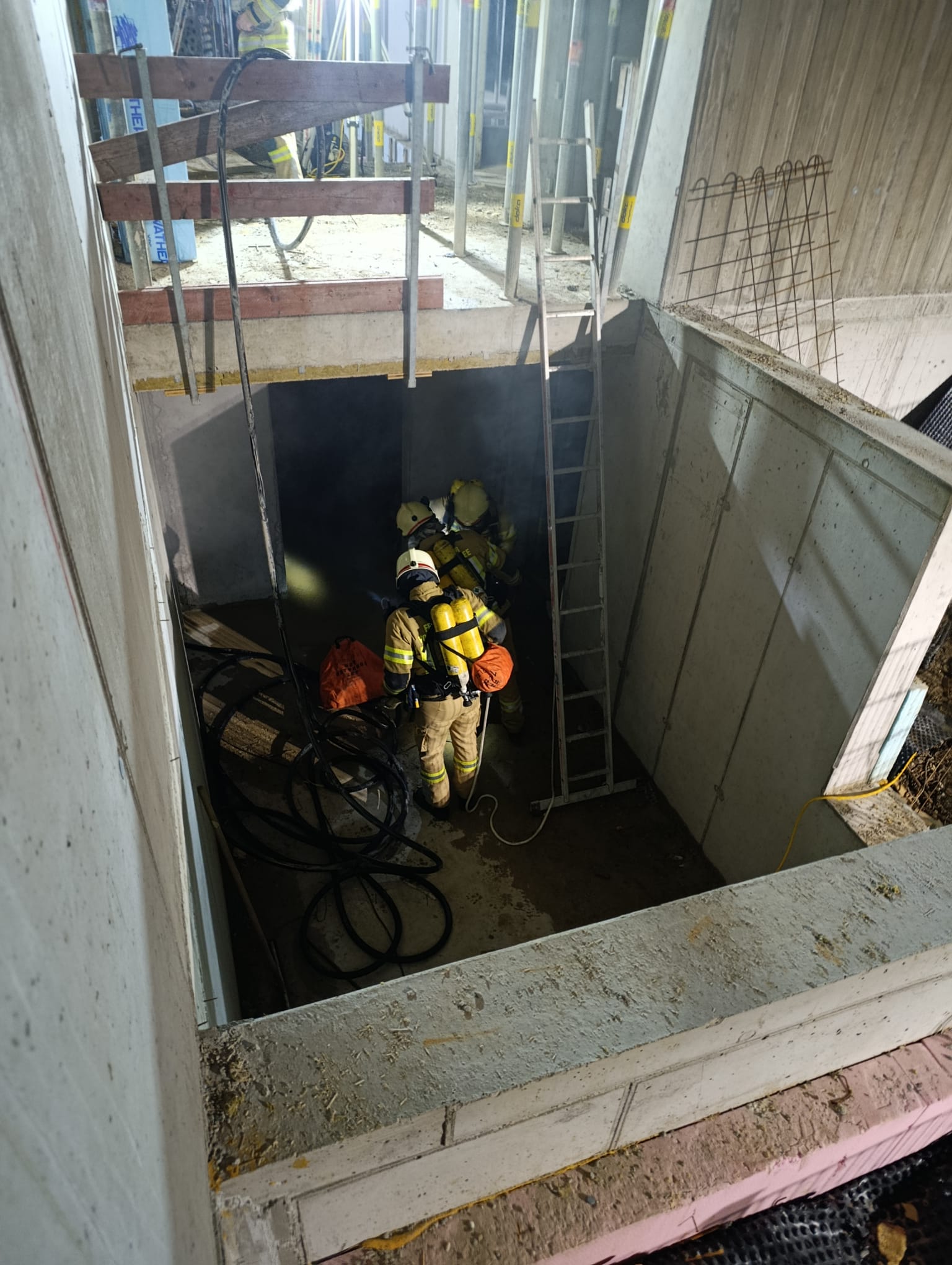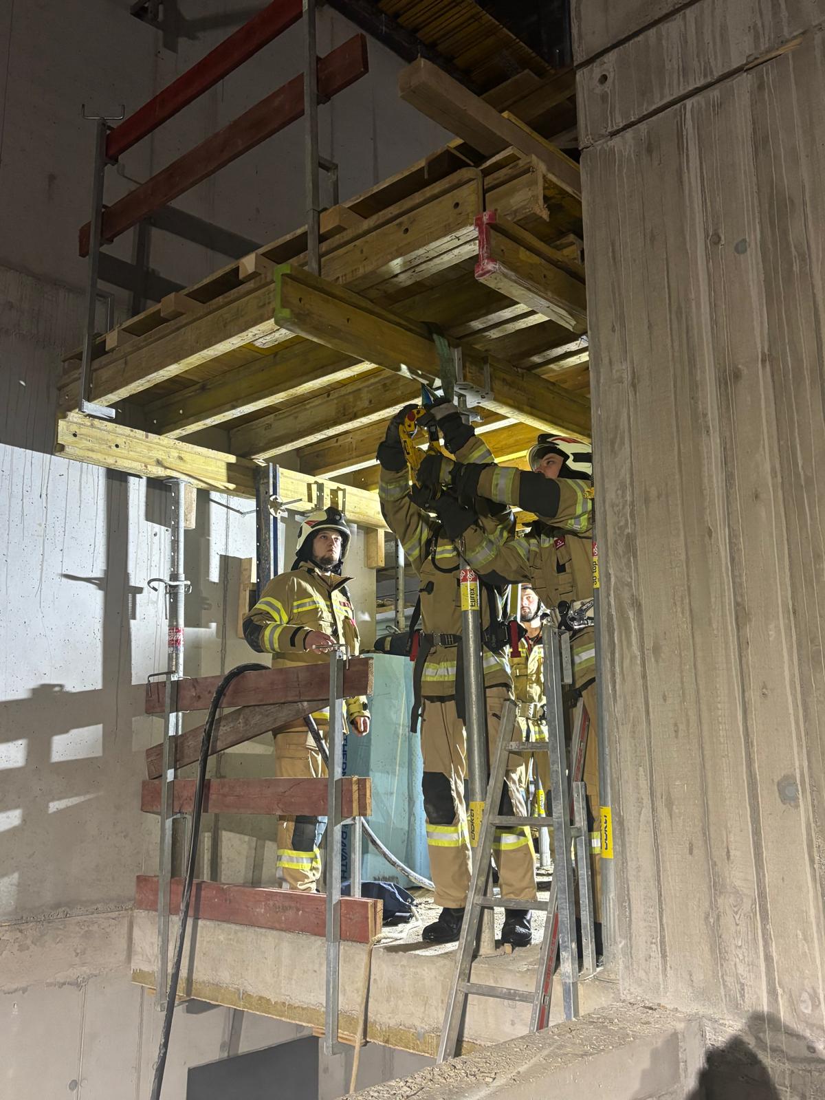 Übungsannahme war ein Brand auf einer Baustelle mit zwei vermissten Personen im Kellerbereich.