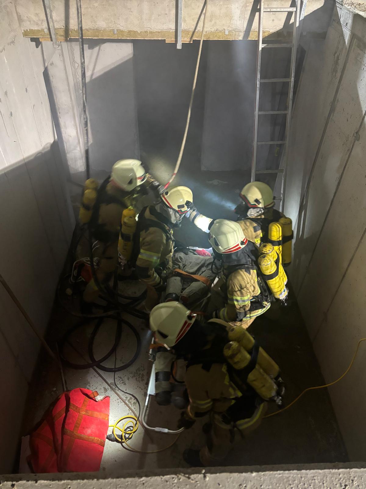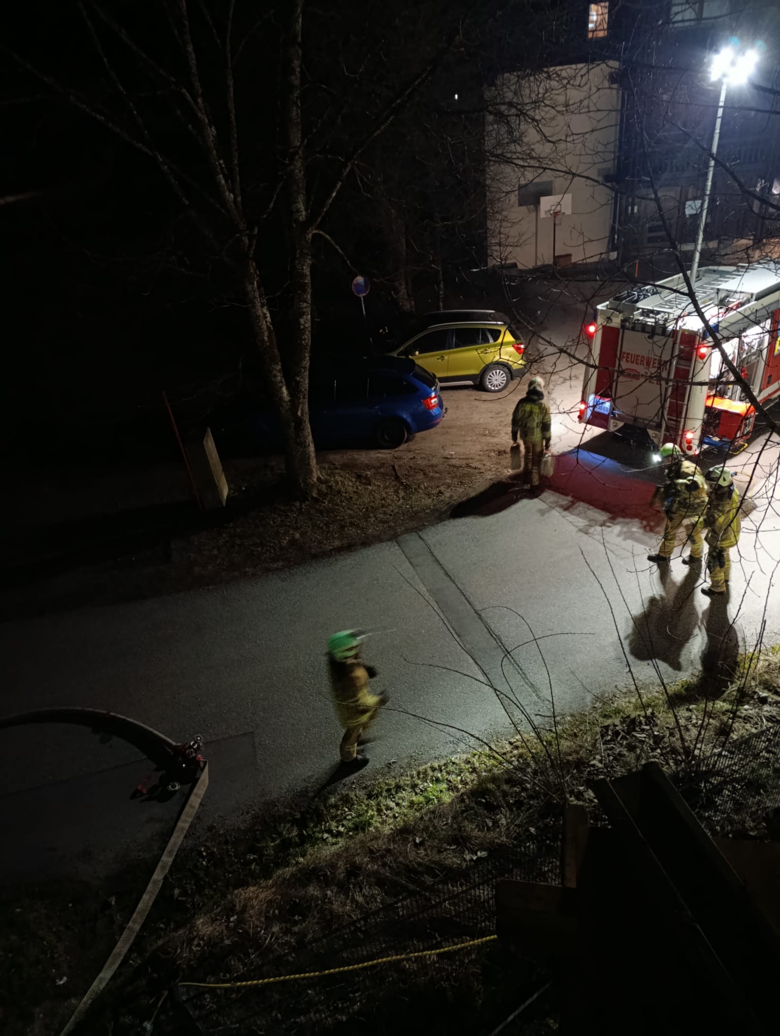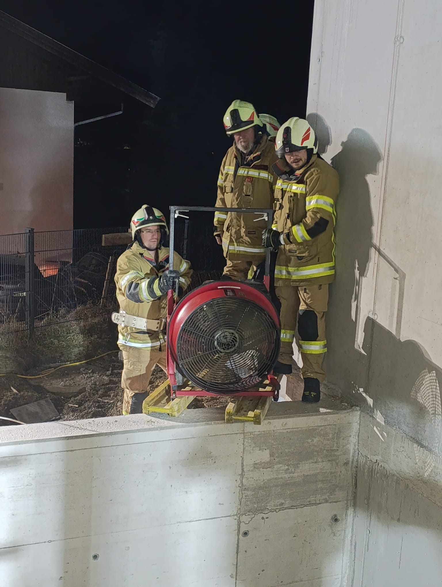 Die zwei Atemschutztrupps fanden im stark verrauchten Keller die Verletzten und bargen diese mittels Trage über eine Leiter in das Erdgeschoss.