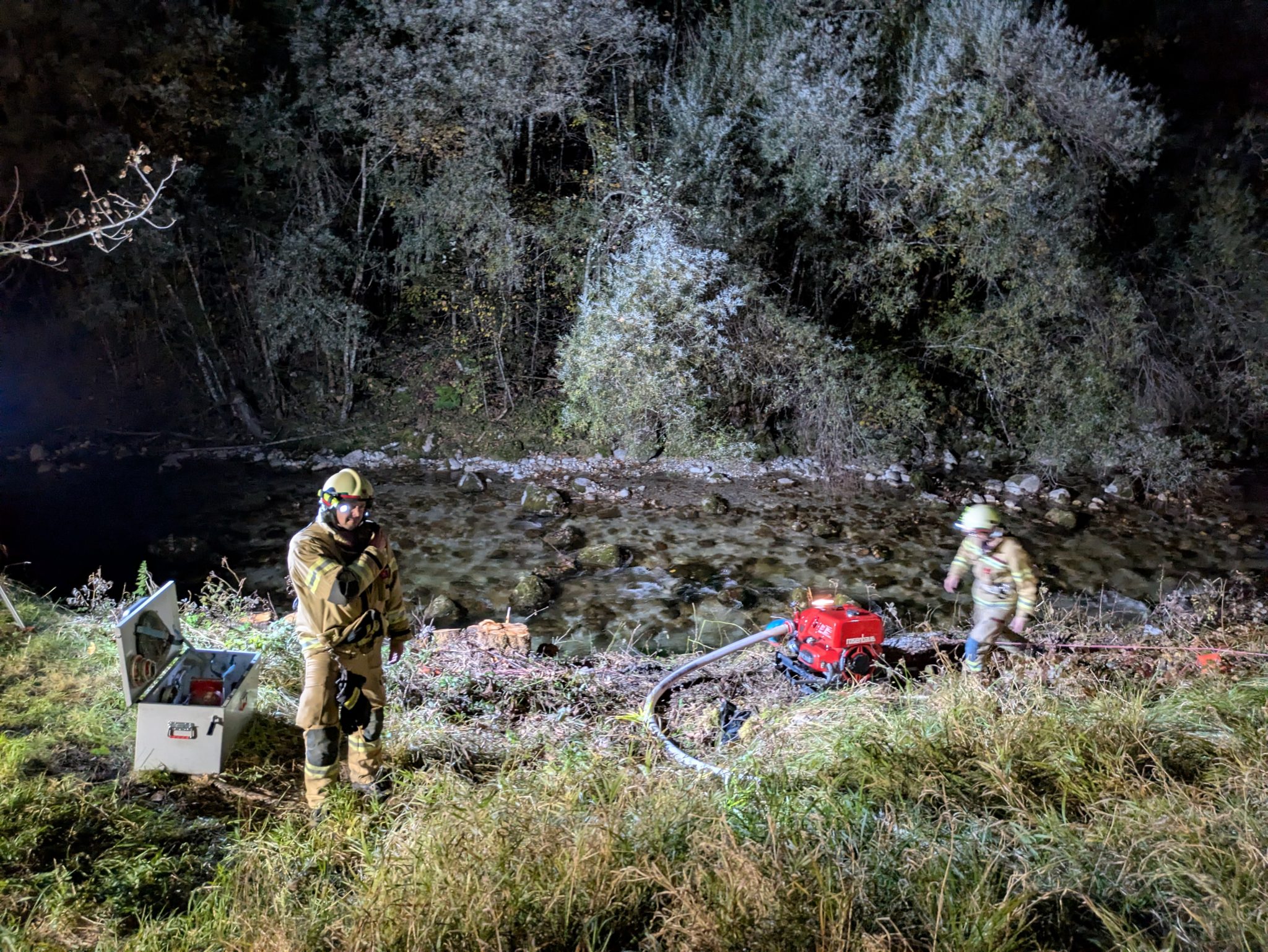 Für die Wasserversorgung wurde wurde von der Thierseer Ache mit der Pumpe angesaugt und 9 B Längen bis zum Übungsobjekt gelegt.