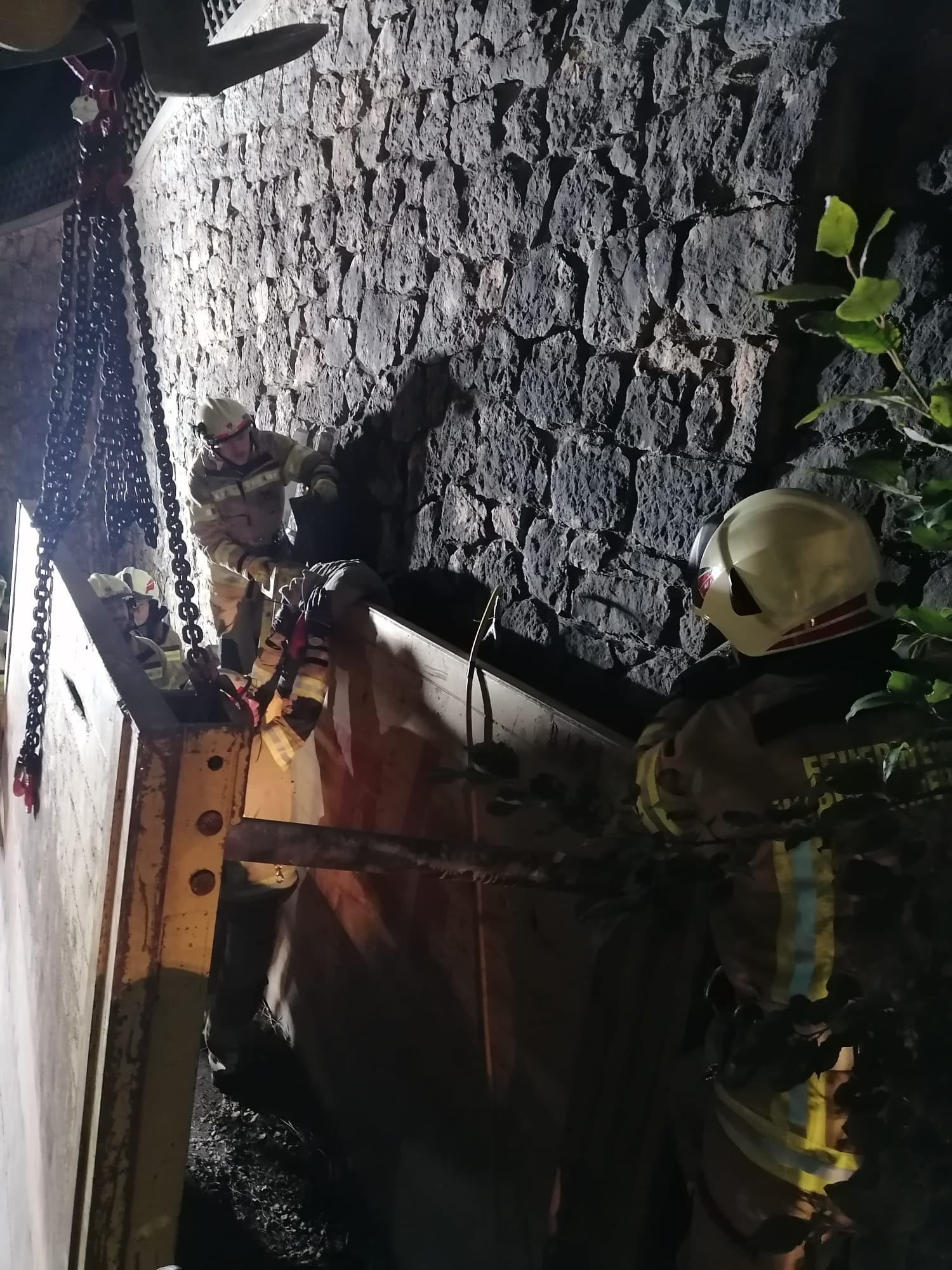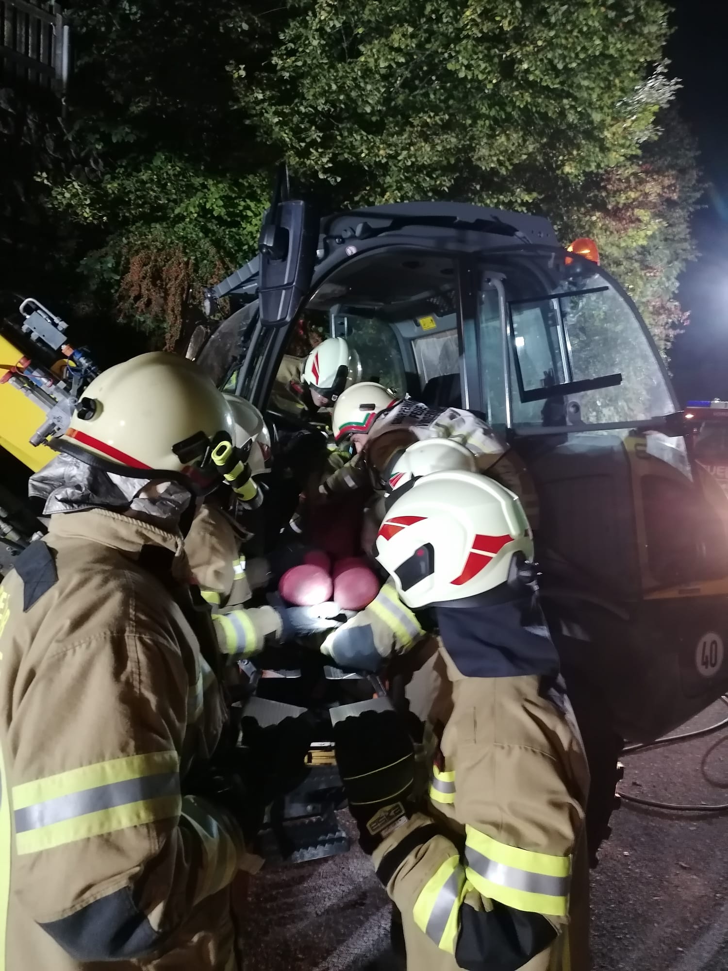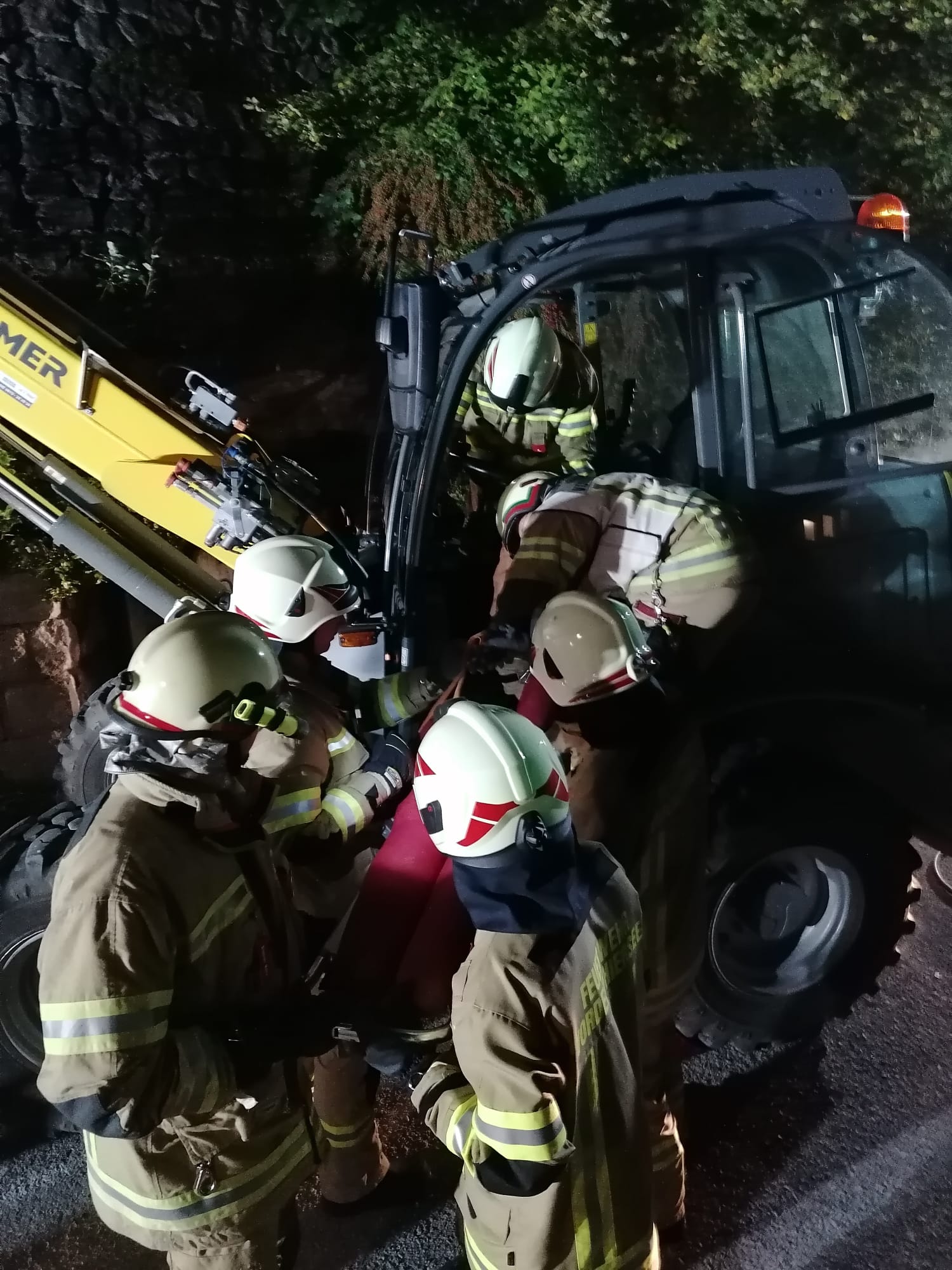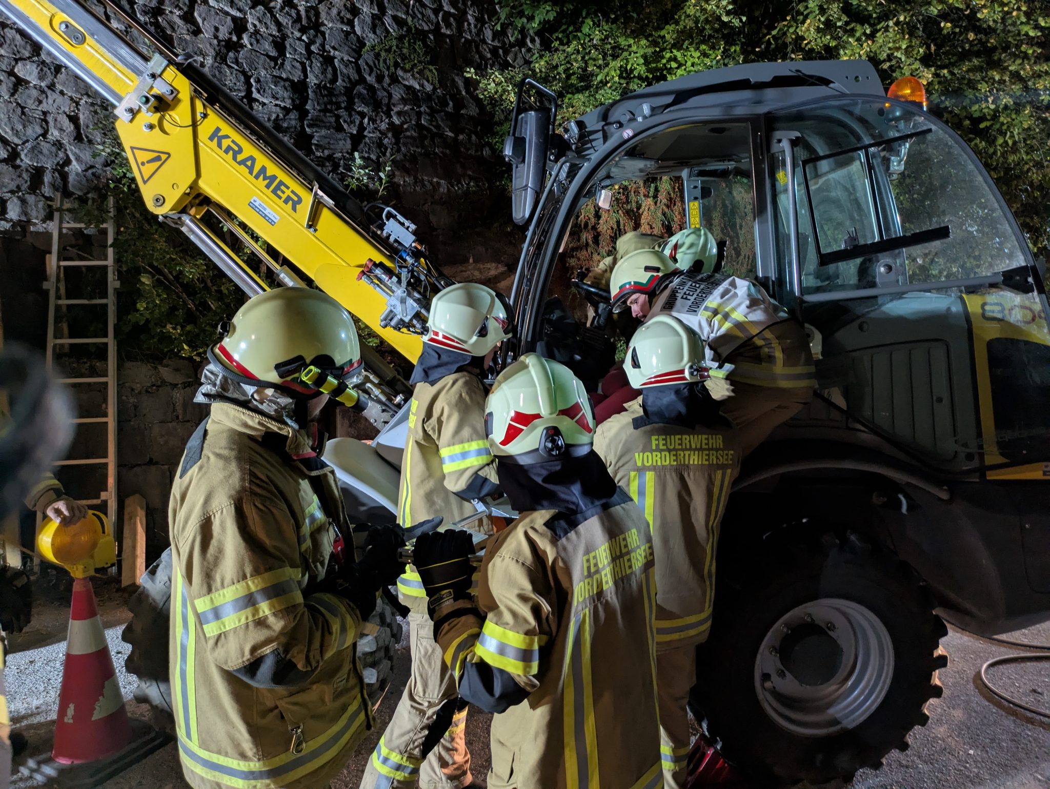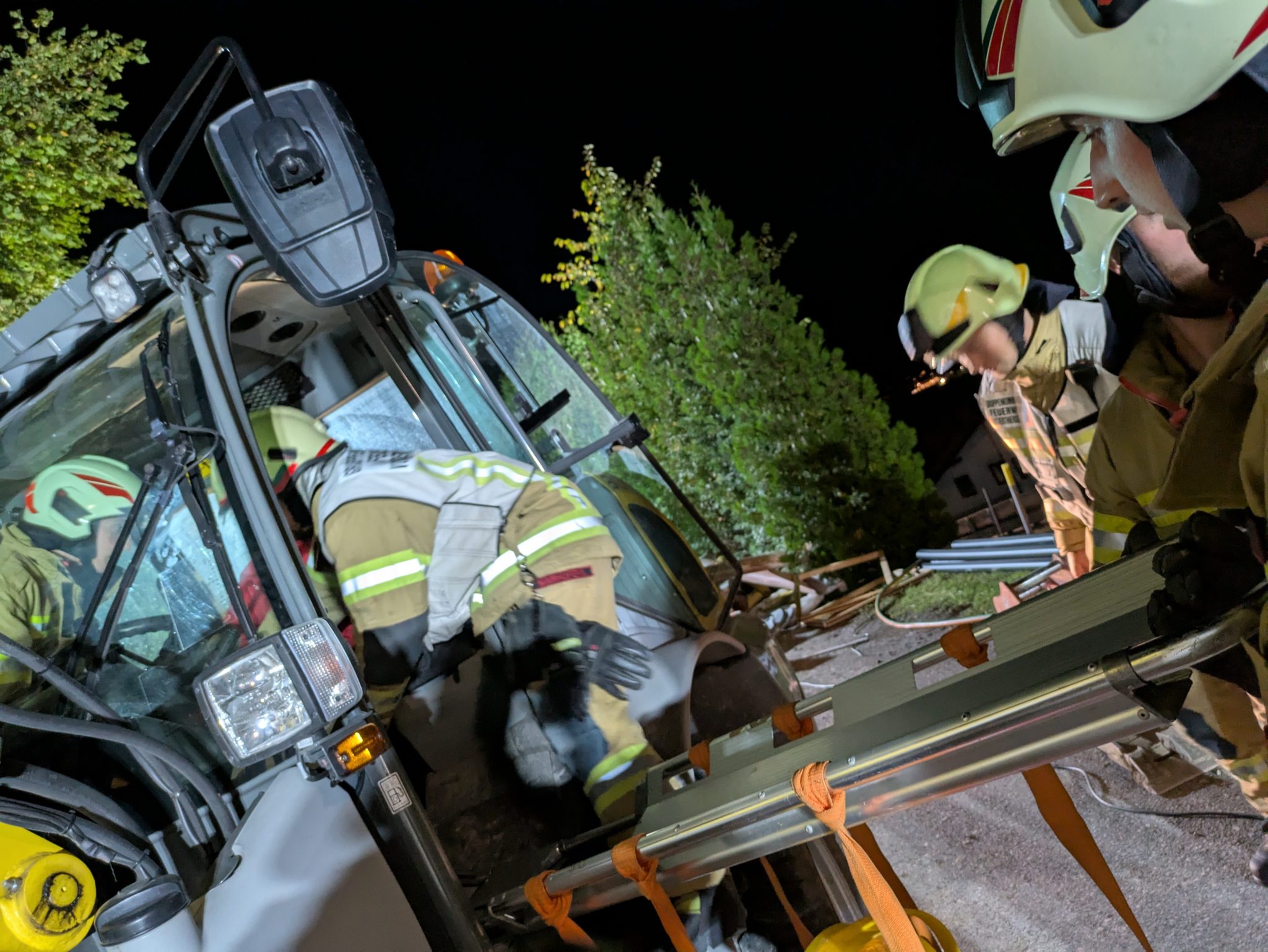 Die Übungsgruppe befreite zunächst die eingeklemmte Person mithilfe von Hebekissen. Im Anschluss barg sie auch den bewusstlosen Lader Fahrer.