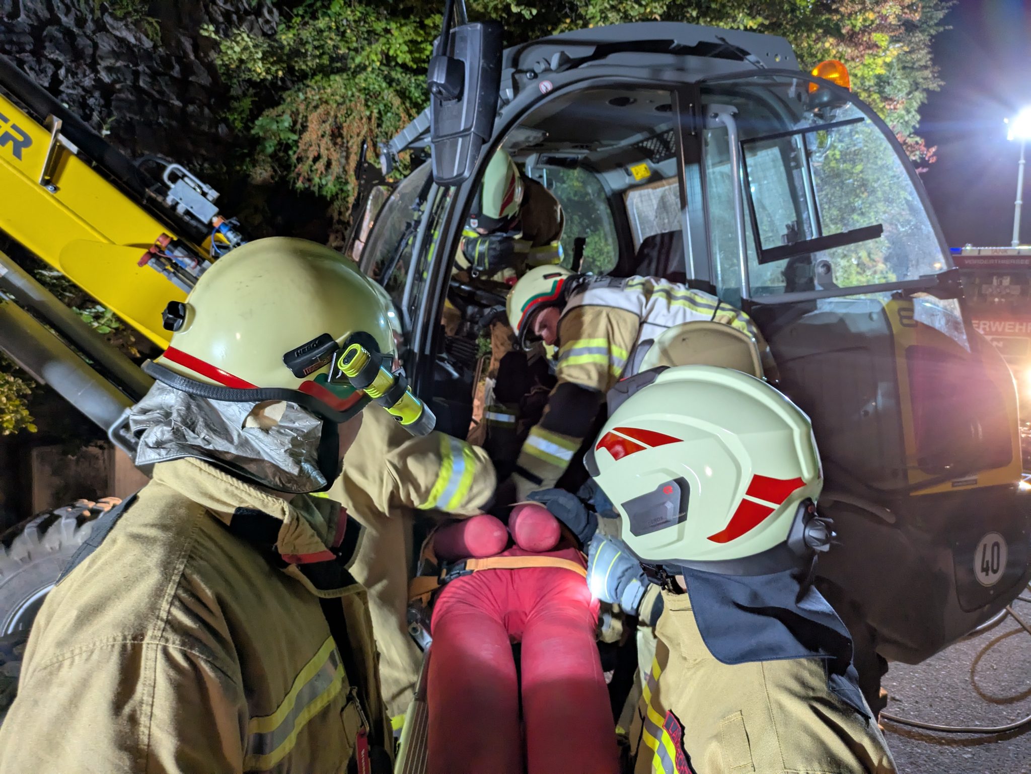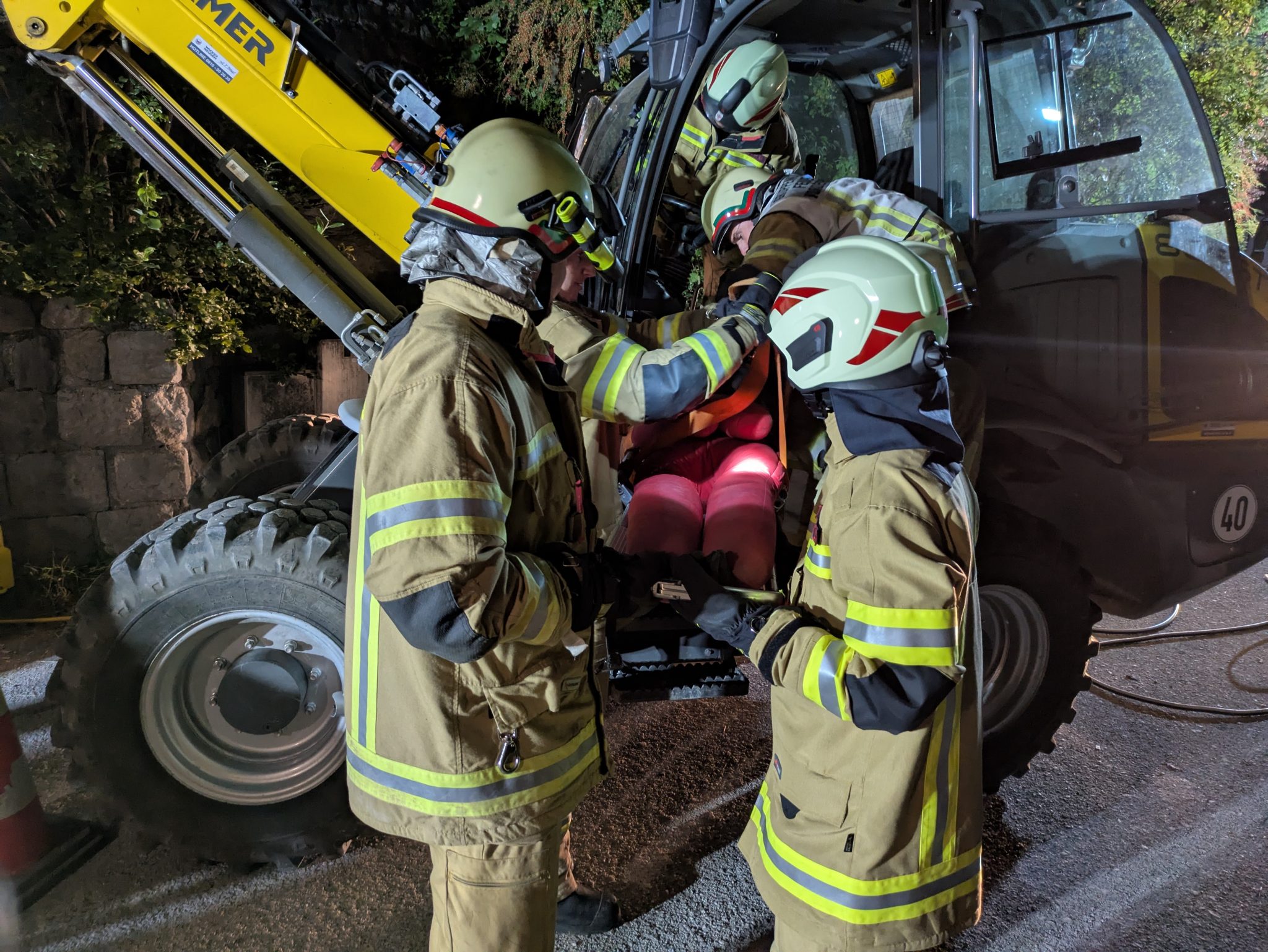 Das Szenario: ein Baustellenunfall mit zwei verletzten Personen. Eine Person war unter einem Baugerät eingeklemmt, der Fahrer des Laders war bewusstlos.